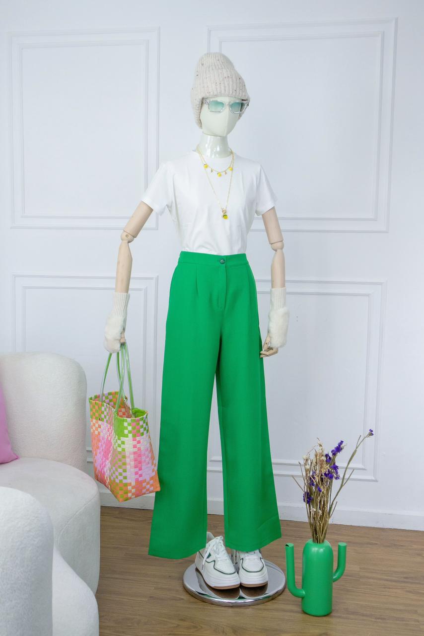 Pantalón de tiro alto con corte amplio que estiliza la figura y aporta movimiento. El color verde lo hace fresco, moderno y muy combinable.🔹 Pretina con botón🔹 Caída fluida🔹 Ideal para looks casuales o sofisticados